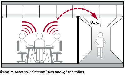 L'isolamento acustico diretto in dB, indicato dall'indice di riduzione acustica (Rw), misura la riduzione del suono che attraversa il controsoffitto sospeso.